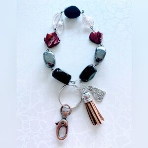 Stylish wristlet bracelet featuring red and black beads. Includes a silver cat charms and a tassel accent. This will fit wrists that measure from 8 1/2” to 9 1/2”.