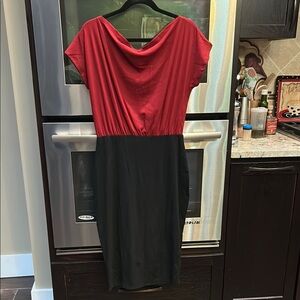 This striking dress features a vibrant red top with a cowl neck and dolman short sleeves, paired with a sleek black sheath skirt. Perfect for a cocktail night out, the dress offers a flattering silhouette with its defined waistline and midi length.