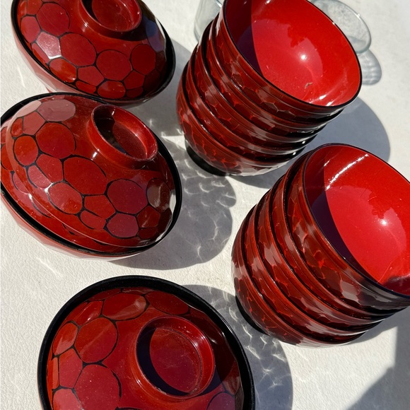 Set of 13 redish orange and black patterned rice bowls. Perfect for serving or decoration. 3 large with lids and 10 small (no lids)