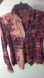 Stylish red and black plaid button-up shirt with a unique bleached design. Features front pockets and a classic collar.
