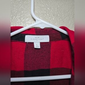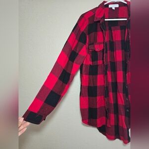 Stylish red and black plaid button-up shirt. Features front pockets and long sleeves. Good condition