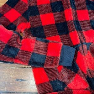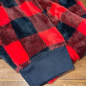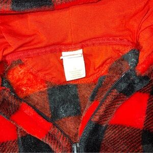 Cozy red and black plaid onesie with a hood. Perfect for lounging.