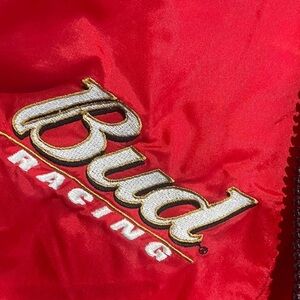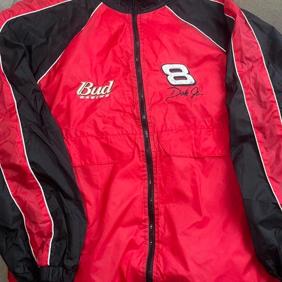 Stylish red and black racing jacket with embroidered logos. Features a zip-up front and sporty design.