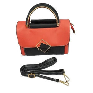 Elegant, sleek, and sophisticated. This two-tone crossbody or hand held purse is the perfect accessory. It has a spacious interior, zipper compartment on back. Quick Access zipper on top. Divided internal compartments with slots and zippers pouches for maximum storage space. Geometric brooch with magnetic clasp. Truly an accessory of sophistication and elegance.