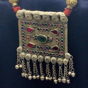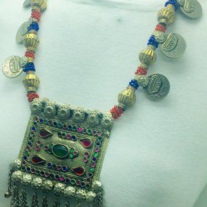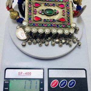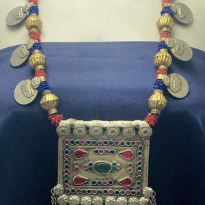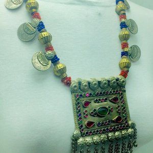 This triangular-shaped tribal piece was handcrafted by extremely talented artisans from Central Asia. This rustic-hued Kuchi tribal massive necklace is comprised of uniqueness and beauty. It depicts history and tribal feel. The necklace has a large pendant at the bottom with multihued glass stones and beaded charms hanging at the both sides.