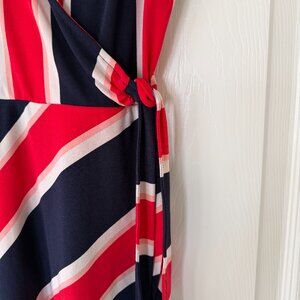 This adorable wrap dress with a tie waist from Express is perfect for any season. Red, blue and white stripes, slit of the side. Great condition, only worn once or twice. Size small petite.