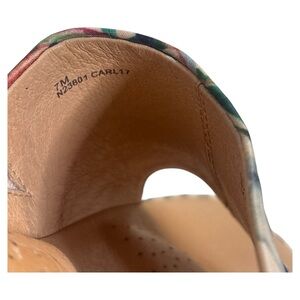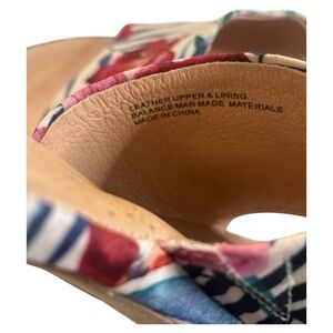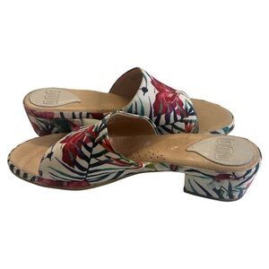 Experience the perfect blend of style and comfort with these red and blue mules, featuring a vibrant floral design. The contoured cork sole offers excellent support, making them ideal for casual outings. Slip into these easy-to-wear shoes and enjoy a touch of elegance in every step. "Brand new without original box."