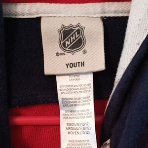 Stylish red and blue hockey hoodie with logo on the front. Features striped sleeves and a rope lace detail.