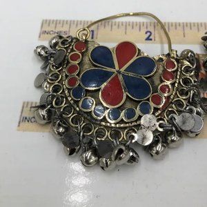 Red and Blue Kuchi Bali Earrings With Small Silver Bells, Ethnic Hoop Style