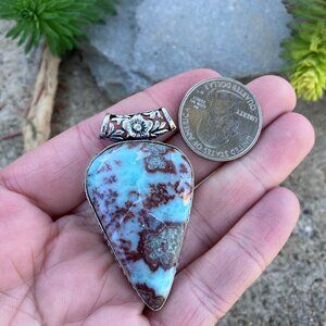 Pendant of a natural red and blue larimar crystal stone in a 925 silver plated frame with a floral bail.