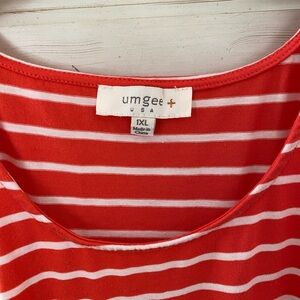 Stylish sleeveless top featuring bold red stripes and a flowing blue bottom. Perfect for casual outings and summer days.