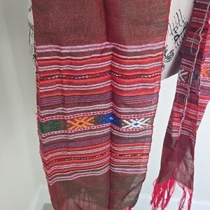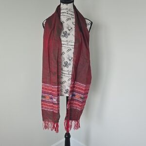 Stylish red and green scarf with fringe detailing. Perfect for adding a pop of color to any outfit.