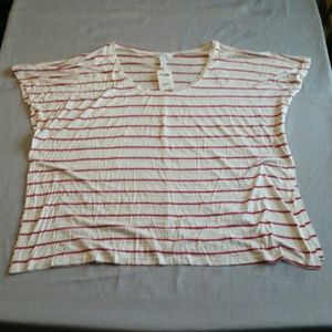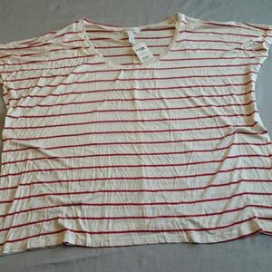 Very cute uncomfortable red and cream striped shirt. This is a size large but I'm thinking an extra large would fit in it too as it is very big. About an inch in on the sides it is stitched up to give it a wing look on the side, but it is still very stretchy and loose.
