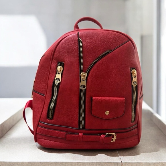 This backpack features a vibrant red color with elegant gold-toned accents, crafted vegan leather. Its structured design ensures it stands upright, offering a modern and stylish look for any occasion.13x12.5x5.5