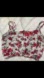 This sleeveless crop top showcases a vibrant floral design with deep red flowers and lush green leaves. The fitted camisole style is enhanced with delicate embellishments, making it a standout piece for any occasion. Its adjustable spaghetti straps and cropped length add a modern touch to this elegant top.
