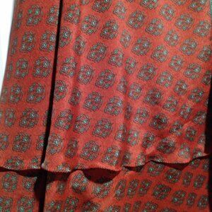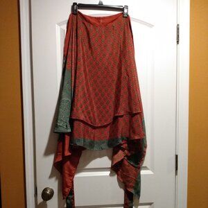 Size medium. Material is light and flowy. There were a couple hanging threads on the edges, but once trimmed, it's in great condition.