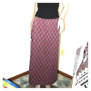 Ankle length red and grey checked (tartan?) ankle length fall/winter skirt. Very cute! No tag but looks to be a medium.                                  Material:  No Tag                                               Waist:  12 1/2"  Elastic                                           Total Length:  36"