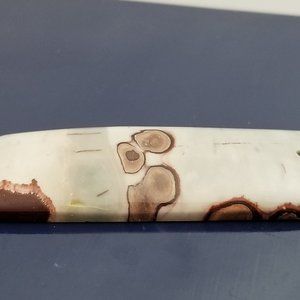This is a gorgeous specimen of Chohua Jasper with formations in the center that remind me of knots on a birch tree. Its colors range from shades of grey in the body to the reddish brown/wine and mauve orbs. It has a flat back and dome front and has been drilled front to back at the top of the stone. It measures 57 x 21.5 x 7.5mm. It will make a great addition to your project. Both faces are well polished.