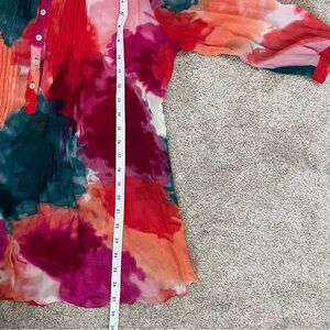 This relaxed blouse features a pleated design with 3/4 sleeves, offering a comfortable and stylish fit. The red and pink hues create a vibrant look, perfect for adding a touch of color to any outfit. Its lightweight fabric ensures a breezy feel, ideal for both casual and elegant occasions.