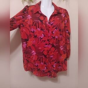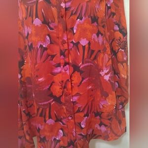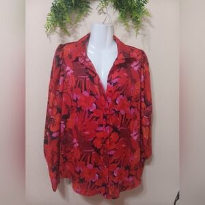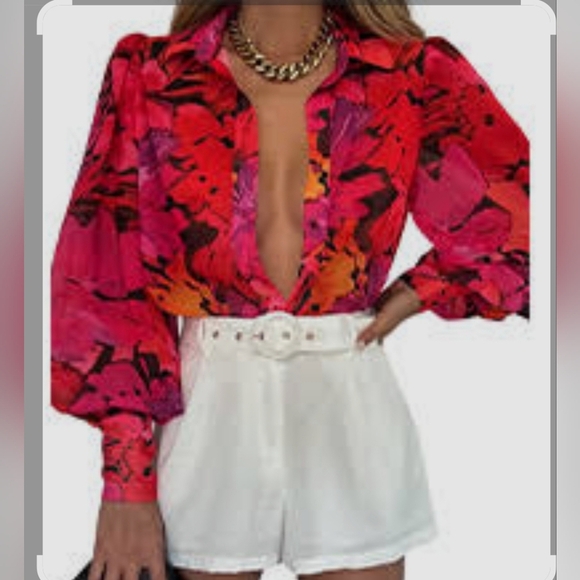 This eye-catching blouse features a relaxed fit with long puff sleeves that gather elegantly at the wrists. The vibrant red and pink hues are complemented by a graphic design, making it a standout piece in any wardrobe. A notched collar adds a touch of sophistication to this button-down style, perfect for both casual and formal occasions.