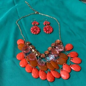 Make a bold statement with this elegant necklace and earring set. Featuring vibrant red and pink hues, this set is perfect for adding a pop of color to any outfit. Ideal for special occasions or everyday wear. Necklace 20” with a 3” extender. Earrings are Shepard hooks and 2”. Thanks for looking.