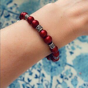 Bold red and silver adjustable wrap bracelet. Just over 2 ½” in diameter, adjusts up.  Brand new. Questions? Drop them in the comments. Bundle for a discount. Thank you for browsing my closet and happy poshing to you.