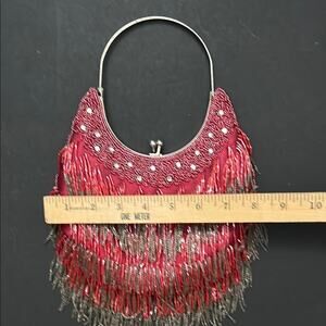 Red and Silver Fringe Handbag With Rhinestones, Metal Handle and Kiss Clasp