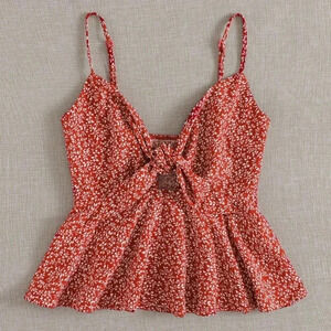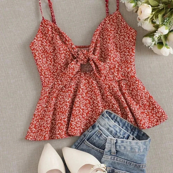 Red and White Boho Womens Ditsy Floral Self-Tie Cami Peplum Top