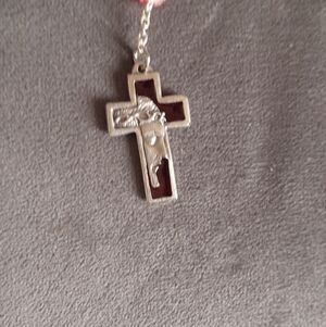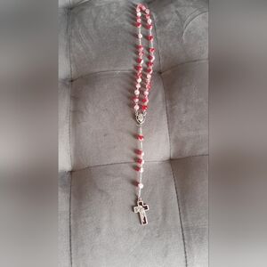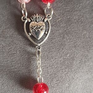Handmade by me. 8mm red crackle beads. small sacred heart rosary center . Red enamel Jesus cross.