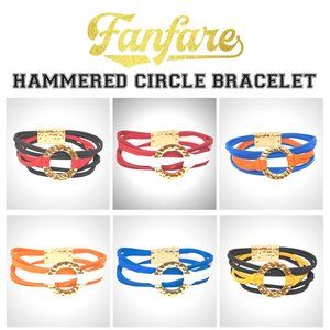 This hammered circle & suede bracelet adds a little edge to your game day getup! this hammered circle and suede bracelet features suede straps, a hammered gold circle and a magnetic closure. It is the perfect arm candy for game days, tailgates, or just any normal day. One size fits most. Nickel and lead free.