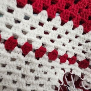 Charming red and white crochet cape for kids. Perfect for adding a cozy layer with style.