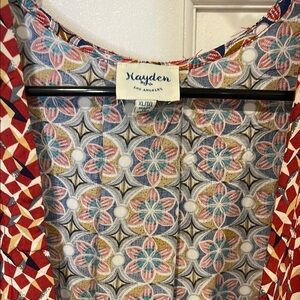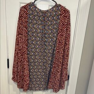 Stylish open cardigan with a red and white geometric pattern. Perfect for layering.
