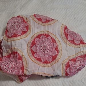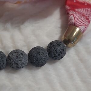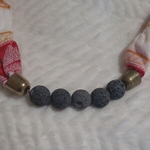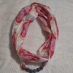 Stylish scarf necklace with red and white patterns. Features decorative beads for added elegance.