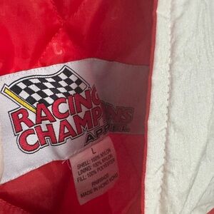 Stylish red and white racing jacket with bold graphics. Perfect for a sporty look.