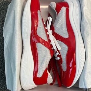 Stylish red and white sneakers with a sleek design. Perfect for casual wear.