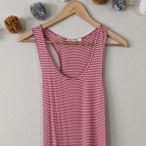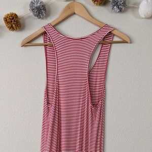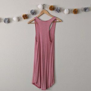 Red and White Stripe Knit Racerback Tank Dress. Scoop neckline. Curved/scoop hem. Size medium measures approximately 13.5" bust + 37" length. Good condition.