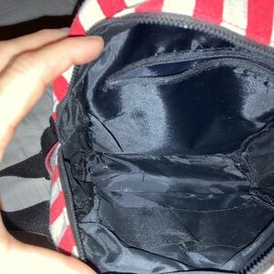 Stylish backpack with red and white stripes. Features a black front pocket with star accents. Perfect for casual outings. Perfect for the upcoming 4th of July!