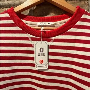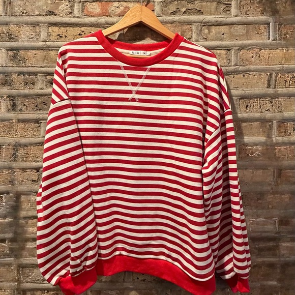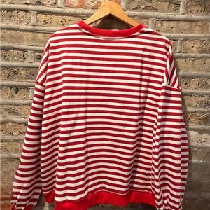 Stay stylish and comfortable with this red and white striped sweater. Perfect for casual outings and adding a pop of color to your wardrobe. Oversized, fits more like a large.