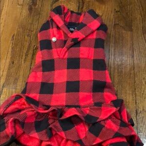 Cozy Red & Black Buffalo Plaid Ruffled Dress. This charming long-sleeve dress features a classic red and black buffalo plaid pattern on a soft, fleece-like fabric. It has a comfortable shawl collar with a single button closure at the neck and a playful tiered ruffled hem. Perfect for a warm, stylish, and festive look!