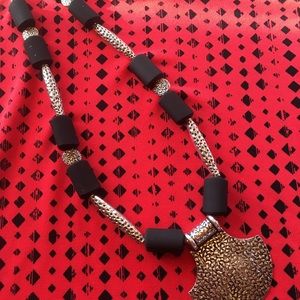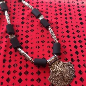 Red and Black Medium flowing tank top with black and silver geometric matching necklace.