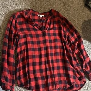 This light and flowy soft plaid top features a V neck line, (no collar) and long sleeves. The sleeves can be worn rolled up to 3/4 length or worn as is. Very cute and comfortable top, great for fall! Only worn once as it is the wrong size for me. No signs of wear other than one of the buttons on the sleeve is missing half. See photos.