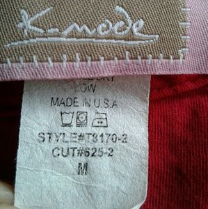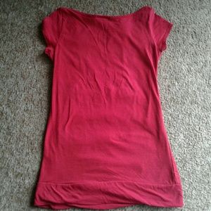Red top made with rips in the center. I guess this would be called "distressed" as I've seen on here..lol. Only been worn once long ago.