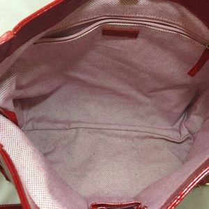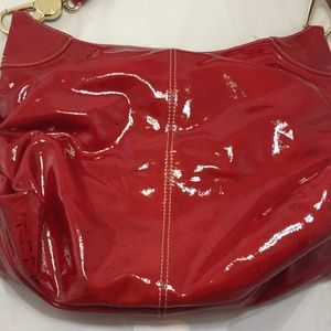 red and black vinyl dooney and bourke purse with gold stitching. pre-owned, great condition. exterior includes: 1 detachable strap, 2 zipper pockets, 2 buckles on both sides. interior includes: 1 cell phone holder, 1 zipper pocket and 1 lanyard. exterior has 2 minor blemishes on the top corners where the strap connects (see picture for details). interior is a soft woven red and white fabric. Approximately 12" L x 4"W x 12"H.