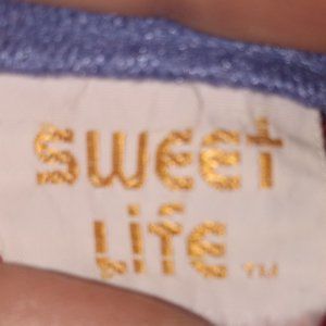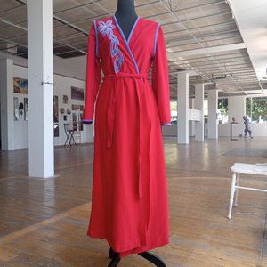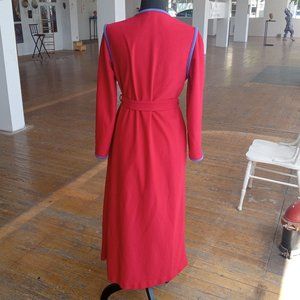 Blue applicate design on one side. Lined and blue on the cuffs shoulders and neckline