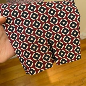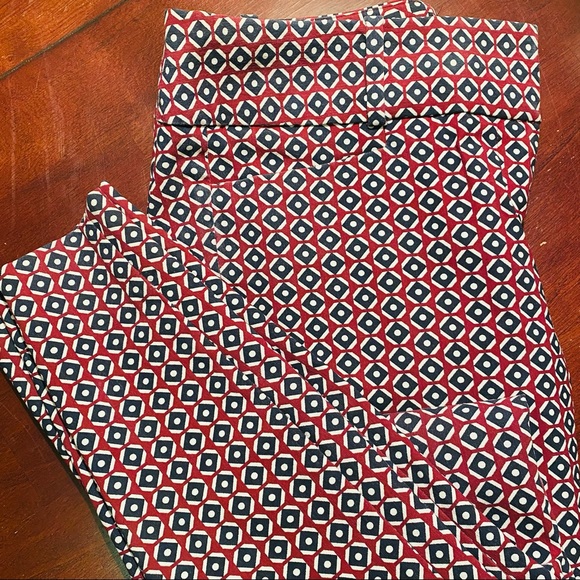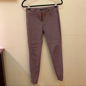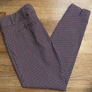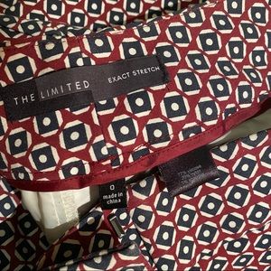 Exact stretch collection from the Limited. Blue and red patterned ankle pants. Small slit at ankles. Front and back slit pockets.