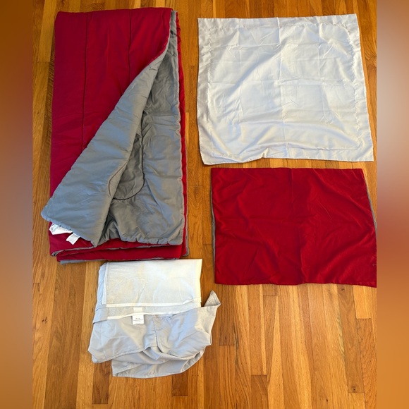 I mixed and matched from two different stores a queen bedding set in red and gray colors as I am an Ohio state fan and used white sheets for a Christmas look of red and white. Great condition. Cat friendly smoke free home.