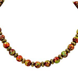 Painted glass bead necklace made in shades of red and green with gold accents mixed in. Each glass bead is separated by matching gold burnished color spacer beads. It's a beautiful and colorful necklace that works with any outfit. New and never worn.