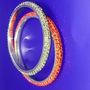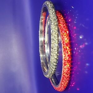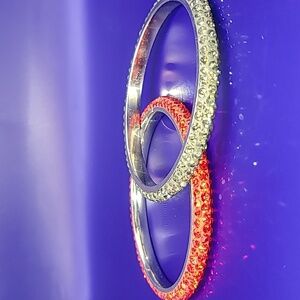 Red and silver tone. Glitsy bangles. Faux stones. No maker's mark. Pre-owned condition. Never worn.