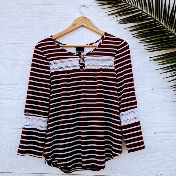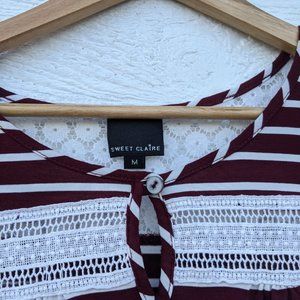 By Sweet Claire. 3/4 Sleeves. Eyelit openong. White crochet lace across front and on sleeves. Floral lace featured on top portion of the back. Very soft/comfortable material