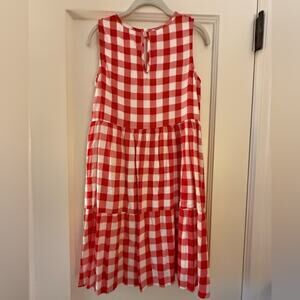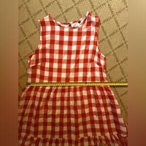 Red and white checkered sleeveless flowy boho dress w tiered ruffled skirt S